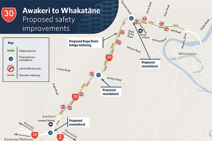 A map showing proposed safety improvements to State Highway 30 between Awakeri and Whakatane include roundabouts (blue dots) left-in-left-out-only intersections (red circles), median barriers (green line) and shoulder widening (orange lines).