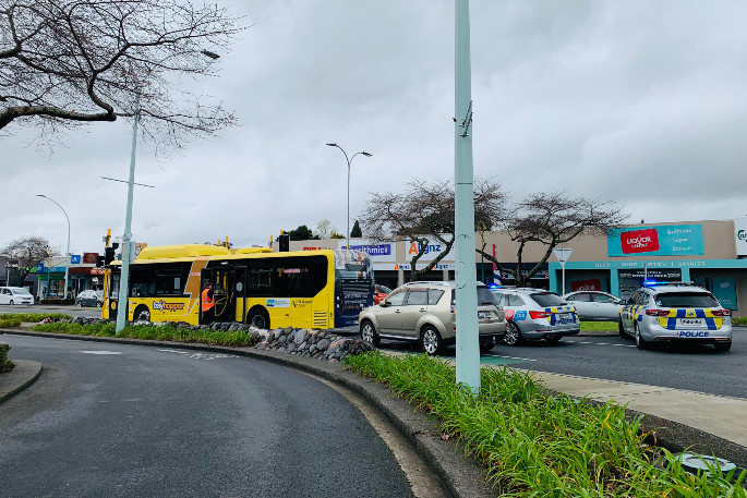 A SunLive reader at the scene says a bus has hit a traffic light near the roundabout at Cameron Road and Chadwick Road in Greerton.