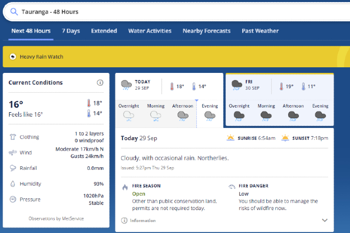 HEAVY RAIN WATCH Area: Northland, Great Barrier Island, Auckland and Coromandel Peninsula Valid: 24 hours from 3:00 am Saturday to 3:00 am Sunday Forecast: Periods of heavy rain, and amounts may approach warning criteria. Area: Bay of Plenty east of Te Puke Valid: 15 hours from 6:00 am to 9:00 pm Friday Forecast: Periods of heavy rain, and amounts may approach warning criteria. Area: Tararua Range Valid: 9 hours from 8:00 pm Thursday to 5:00 am Friday Forecast: A period of heavy rain, and amounts may approach warning criteria. WATCHES NO LONGER IN FORCE Heavy rain watch lifted for: Mount Taranaki: The threat of heavy rain has passed so the watch is lifted.