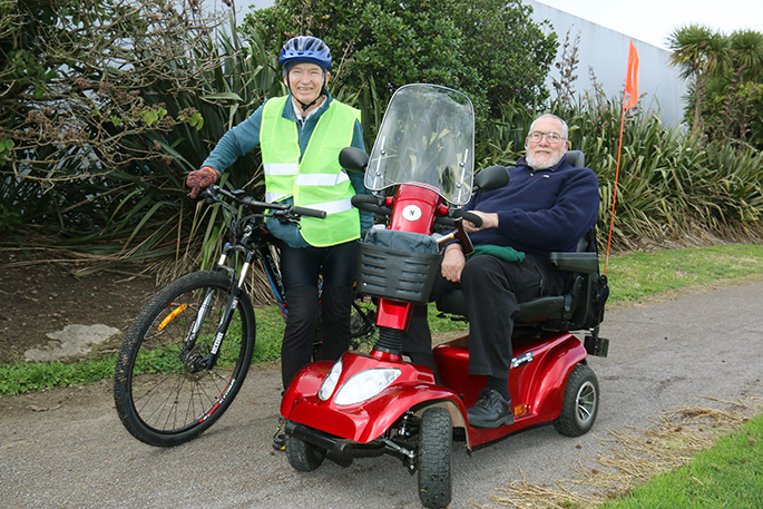 Iain Bibby on his bicycle with Ian Birse on his scooter in 2017, after the men set up the Pāpāmoa Cruisers group. Photo: Rosalie Liddle Crawford.