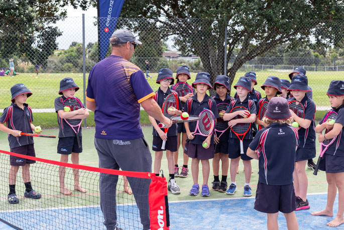 Enthusiastic young groms at Te Ākau ki Pāpāmoa School and Tahatai Coast School took off their jandals for 45 minutes and hit the court for free introductory skills sessions with top coach Peter Blow.