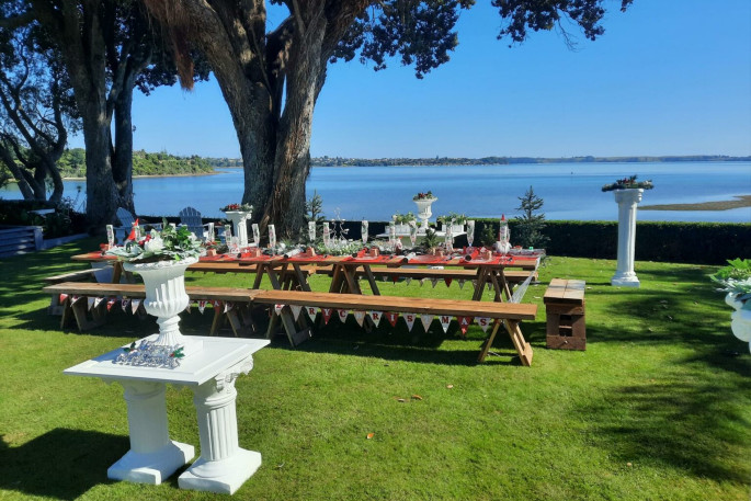 White Cape Cod chairs under large overhanging pohutakawa give a particularly Kiwi Christmas flavour, with the outlook taking in the moored yachts of Omokoroa and the distant view of Matakana Island.