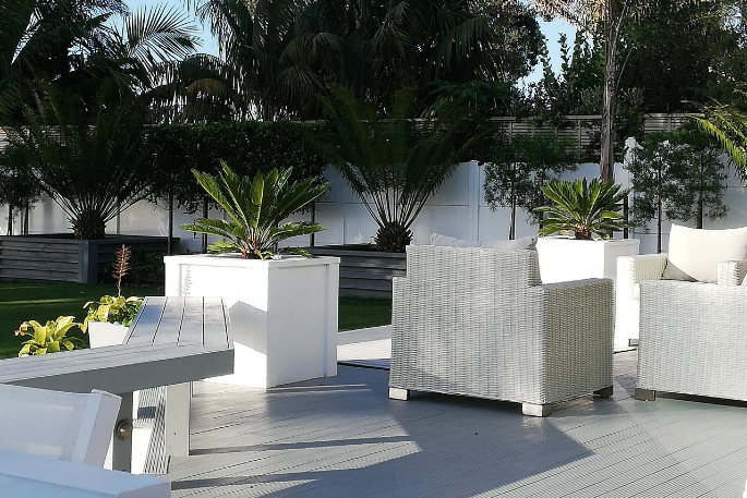 The white theme continues, with the deck featuring white cane armchairs and small palms growing from large white wooden boxes. It's clear Leanne and Hamish love a white and green theme, enhanced with the traditional red of Christmas.