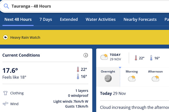 A heavy rain watch is in place for the Tauranga area. Image: Metservice.