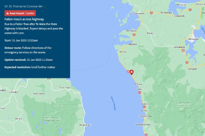 Earlier, 11.25am: State Highway 25 between Thames and Coromandel is blocked due to a fallen tree across the highway.