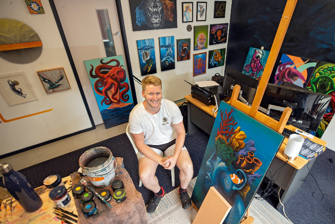 Sam's forte in the art world is outdoor-focused, with his incredible murals making their mark across Tauranga.