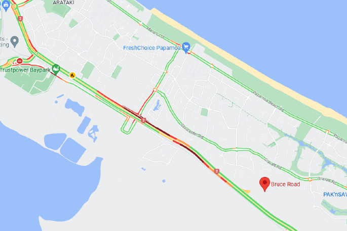 State Highway 2 before Bruce Road, Pāpāmoa is down to one lane following a crash.