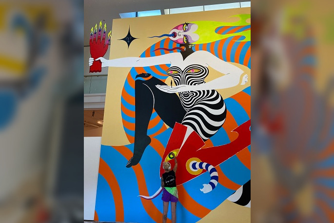 Tauranga Art Gallery's atrium has been transformed into a vibrant, psychedelic world dominated by an epic, fire-breathing taniwha by Te Whanganui-a-Tara-based Dream Girls Art Collective.