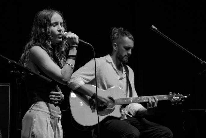 Singer songwriter Sophie-Maude performs with Ash Rogers at the Bay Originals Benefit Concert. Photo: Jade Manyweathers.