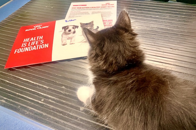 Three-month-old Clyde, checking out his new health pack while registering for the first time at Koru Vets. Photo: Rosalie Liddle Crawford.
