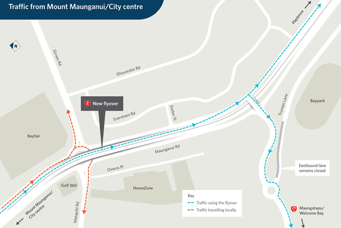 - As work continues at ground level at the project's Baypark end, all road users using the Bayfair flyover to connect with SH2 Tauranga Eastern Link or SH29A will use the SH2/SH29A Te Maunga interchange.
