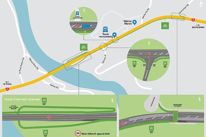 The ONLY reason why cycleway doesn't stay on same north side of SH2 as cycle bridge & run up as a straight line exit into Carmichael Rd is because TCC & NZTA did a private deal with Wairoa Marae who objected to this happening (NIMBY) after originally approving it. No consultation with other parties was allowed despite being requested for 2 years. Rob Campbell featured in story told 2 representatives of Bike Tauranga they "did a deal" with Wairoa Marae to get some other concessions on other roads nearby (read TNL) . Its got nothing to do with better safety of cyclists or considering already clogged traffic which when road work finishes will also be stopped in its tracks every time a bike needs to cross over. NZTA & TCC spent another $5million creating this chaos to suit themselves. Time to sack Rob C NZTA & Brendan Bisley TCC