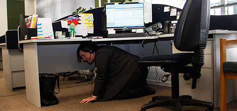Tauranga City Council call centre manager Di Hobson takes cover under her desk.