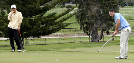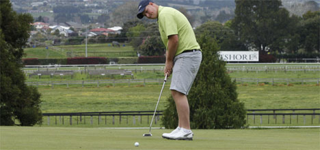 Jonny Ratcliffe from Auckland putts while Jonathan Park looks on.