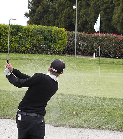 Jayson Zulch from Auckland hits his ball out of the bunker on the 18th hole.