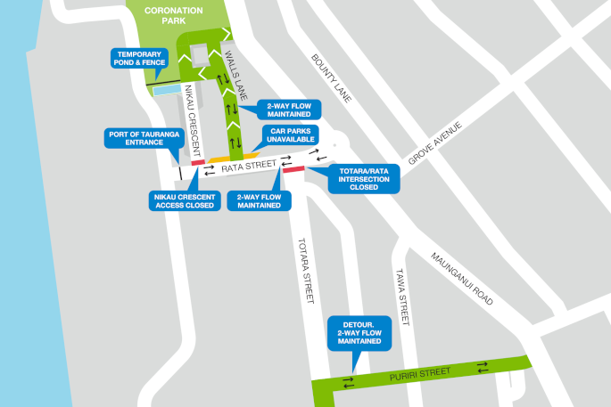 Image: Tauranga City Council. Parking on the northern side of Rata Street remains closed, and parking is reduced on Nikau Crescent. Access to Nikau Crescent from the Rata Street/Nikau Crescent intersection remains closed. A detour via Walls Lane is available for residents and vehicles needing to access Nikau Crescent. Pumps may be discharging water to a contained area near the entrance of Coronation Park, as required, where fencing and signage is in place. The full project is expected to be complete by the end of October 2023. We will continue to provide updates throughout the project and would like to thank the community for their patience as we carry out this important work.