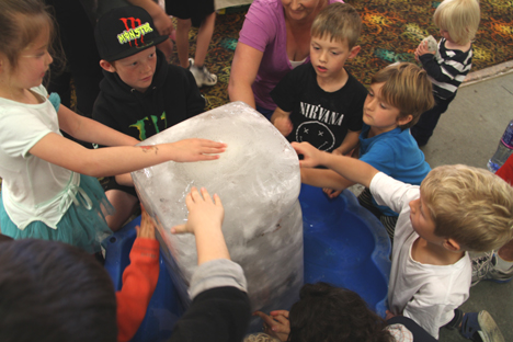 A block of ice about 1m tall was a main attraction keeping children occupied as they frantically rubbed the sculpture hoping the warm temperature of their hands would melt the ice to reveal the crystals inside.