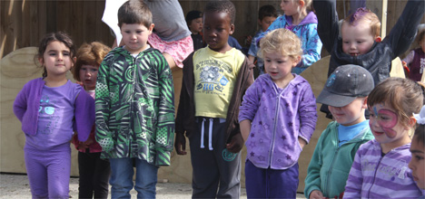 Twin sister Indee, 2, and older brother Bailey, 4, are enjoying the day's activities, which include icing purple cupcakes, playing with a tub of purple water and meeting Barney the Dinosaur.