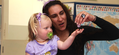 Indee, who loves playing with water and playdough and watching Dora the Explorer, is enjoying spending the morning snuggling with Rachel and eating a purple cupcake, while Bailey is making friends with Barney the Dinosaur.