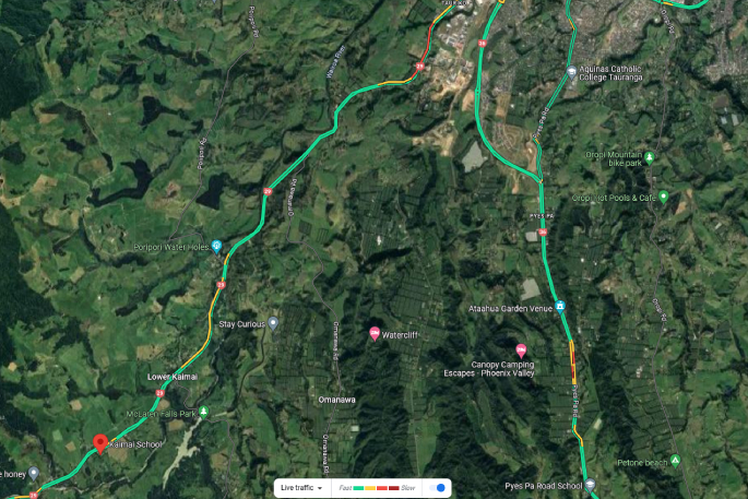 Google Maps shows traffic stalls in several areas along State Highway 29 from Kaimai School.