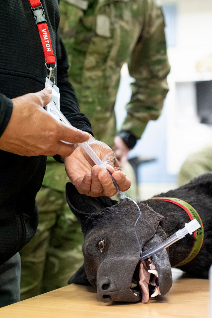 “This is my first introduction to canine trauma training and my first time using this type of mannequin. Being able to physically insert a needle into a mannequin’s vein and set up an intravenous line is very different from just learning the theory of how to do it.