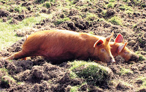 | Happy as a pig in muck. These two organically raised pigs will qualify for the RNZSPCA's new ‘Blue Tick'. |