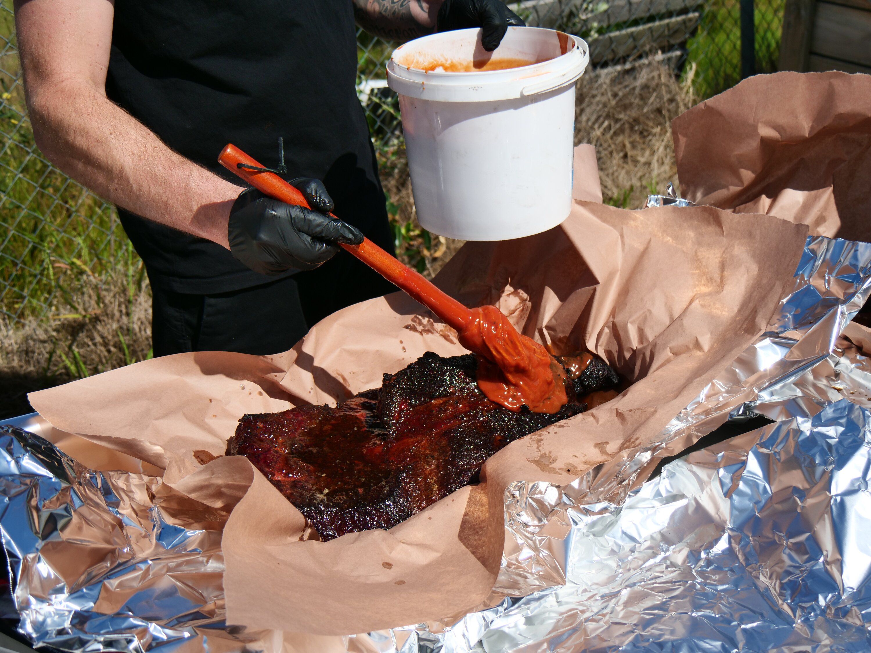The Brisket, about to be wrapped in peach butcher paper and put back into the smoker. Photo / Tom Eley