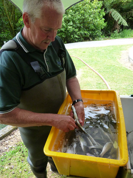 Fish and Game Officer Lloyd Gledhill clipping the fins of the young trout (sedated) at the hatchery before their release.