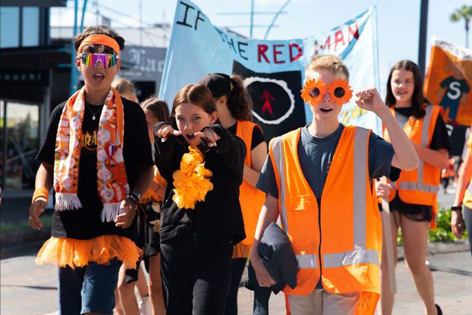 Downtown Mount Maunganui will be engulfed in orange today, as more than 700 primary and intermediate school students march and wave banners in the Road Safe Orange Walk.