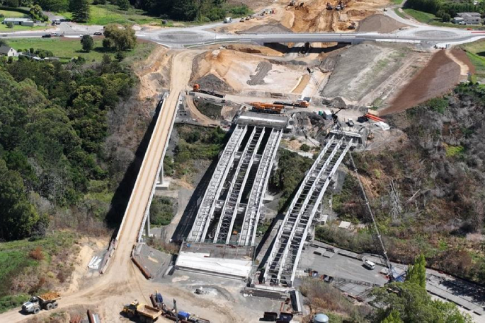 There are three bridges under construction over Minden Gully. The main alignment deck (centre) will be poured over the coming weeks and the off-ramp (left) is in use for construction vehicles. Photo / NZTA Waka Kotahi.