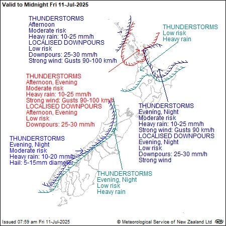 There is also moderate risk of thunderstorms this evening for Coromandel and Bay of Plenty with strong wind gusts of 90 to 100km/h.