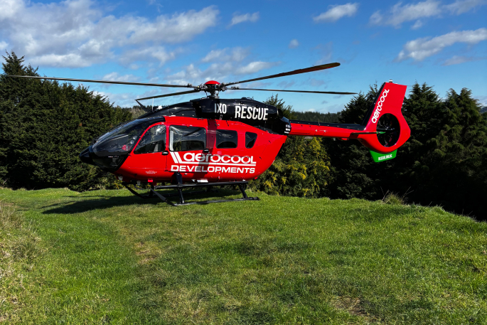 The Aerocool Rescue Helicopter landed at a staging point on the Pāpāmoa Hills to offload equipment and prepare for winching the patient and Critical Care Flight Paramedic out. Photo / Supplied