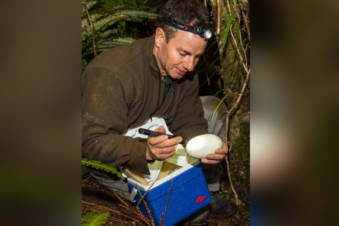 Forest Lifeforce Restoration Trust chairman Simon Hall inspects a kiwi egg retrieved as part of Operation Nest Egg . Photo/ Supplied.