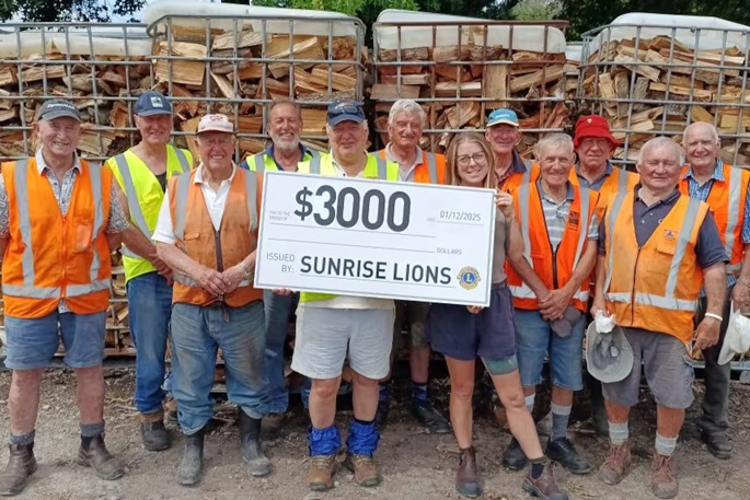 Tauranga City Sunrise Lions gathered on December 2 at Greerton firewood yard to gift $3000 to the Tauranga Community Foodbank.