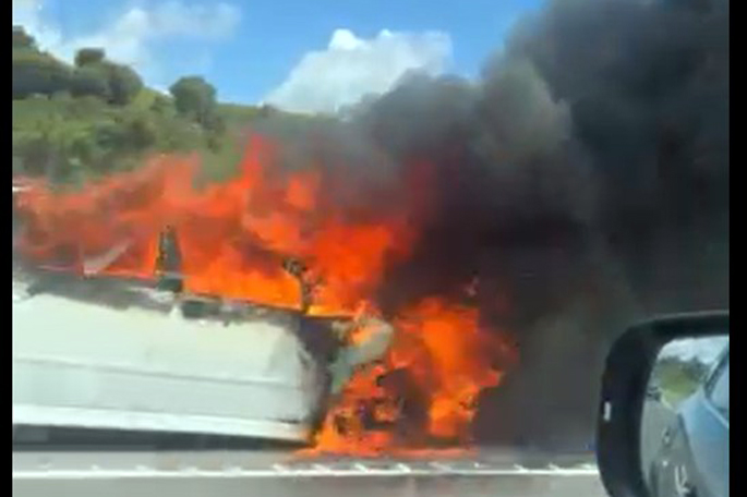 A video sent to NZME shows flames and smoke billowing from the front of the vehicle, which had pulled over on the side of the road.