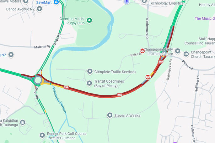 Traffic is backed up on SH29, near the Oropi Rd roundabout. Image / Google Maps