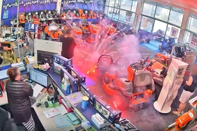Customers got a lot more excitement than they might’ve expected from a visit to a lawnmower shop in November when fireworks began exploding around their feet.
