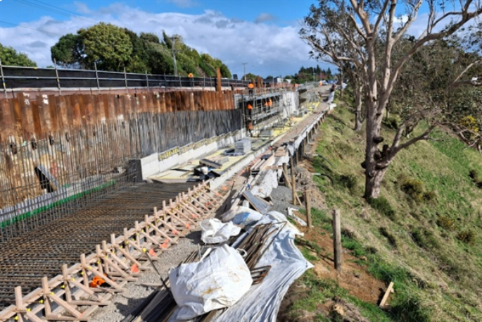 The SH29/Cambridge Rd intersection upgrade began in late 2024 with the construction of a 210m retaining wall supported by temporary sheet piles. The first stage of removing those piles is already under way behind safety barriers, with no impact on traffic.