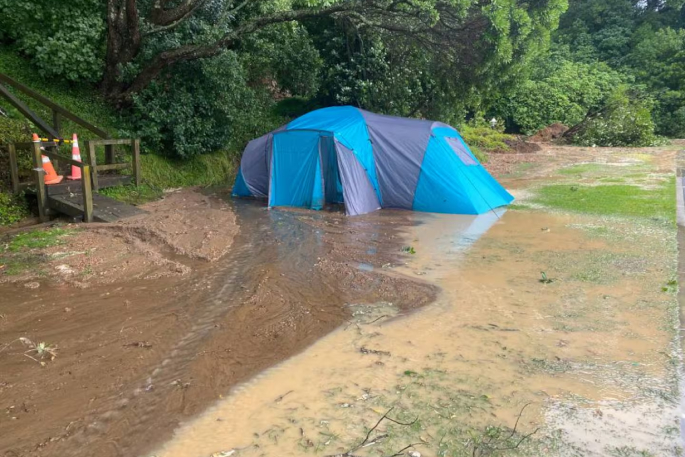 Lance Macfarlane and his daughter were staying in this tent when he was woken up at 5am by teacher Lisa McClennan who warned him to get out. Photo / Colin McGonagle