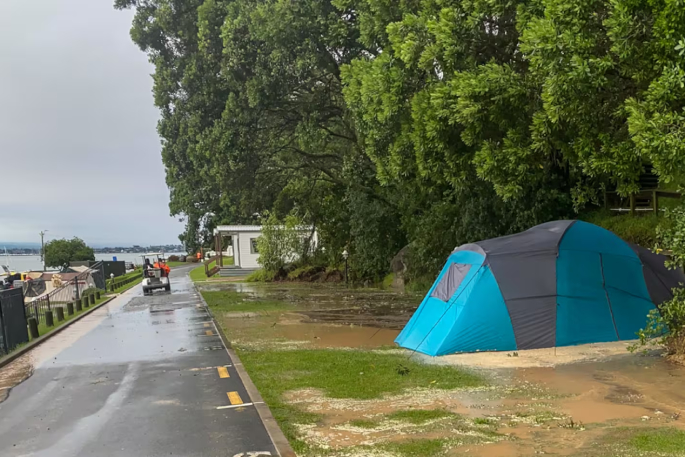 A photo at the Mount Maunganui campsite taken early Thursday show Lance Macfarlane's waterlogged tent and staff in a golf buggy at 7.42am. Photo / Colin McGonagle