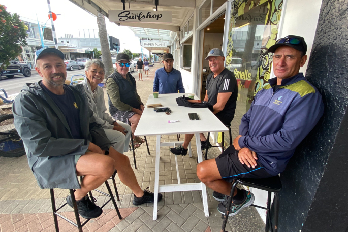 ‘Sean’s Mob’ meeting for coffee at the Mount Surfshop on Monday morning.  Photo / Rosalie Liddle Crawford