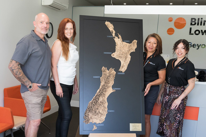 The result is a large, three-dimensional wooden map of New Zealand, now gifted to Tauranga’s Blind Low Vision NZ, allowing people to trace mountain ranges, follow coastlines and experience the shape of Aotearoa through touch.
