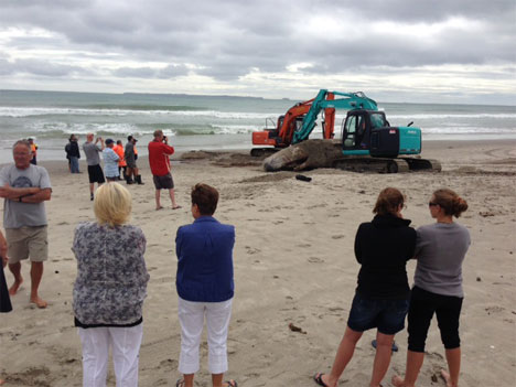 People gathered to watch the burial of the sperm whale at Papamoa Beach today.
