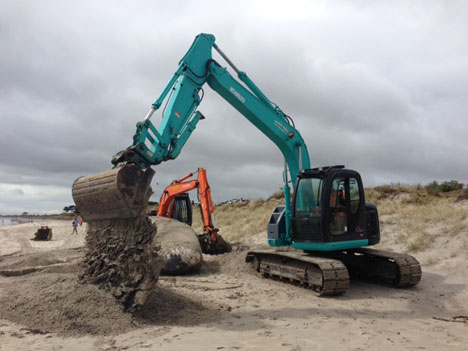 Diggers work to remove sand down to at least four metres to bury the whale.