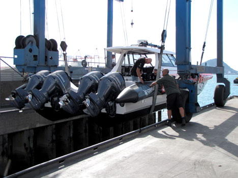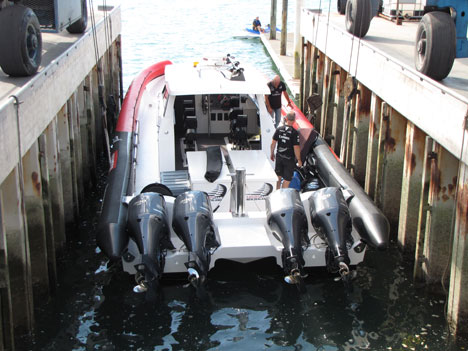 The rank of four 300hp V6 outboards across the back are not for speed, they are for power, says Chris.