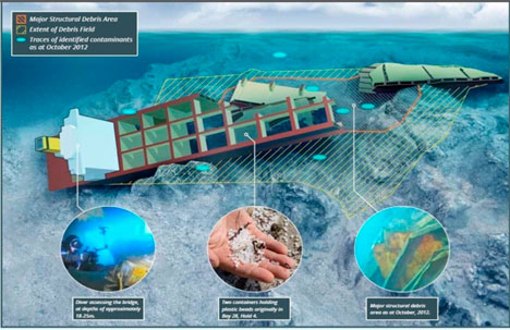 The remains of the bow section of Rena taken on April 2, 2013.