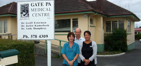 Nurse Cathy Haxell, Dr Geoff Esterman and healthcare assistant Mihi Reweti outside the Gate Pa Medical Centre.