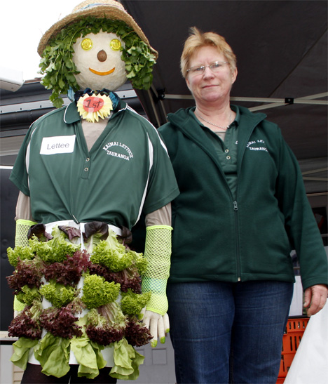Lyn says her scarecrow from last year had a full apron made out of lettuce and this year Lettee has a mini-skirt and legs.