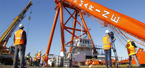 This week, two shore cranes will assist with the re-rigging, and unfolding of the RMG 500's A-frame.