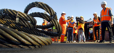 Each link in the chain weighs about 100kg and is made of 76mm thick steel. The anchors that will hold the barge in place while the yet to be assembled chain pullers pull the chain to and fro, will weigh 15 tonnes each. The wire strops that will guide where the chain cuts can be barely lifted, will be man-handled into place underwater by divers working at the air breathing limit.